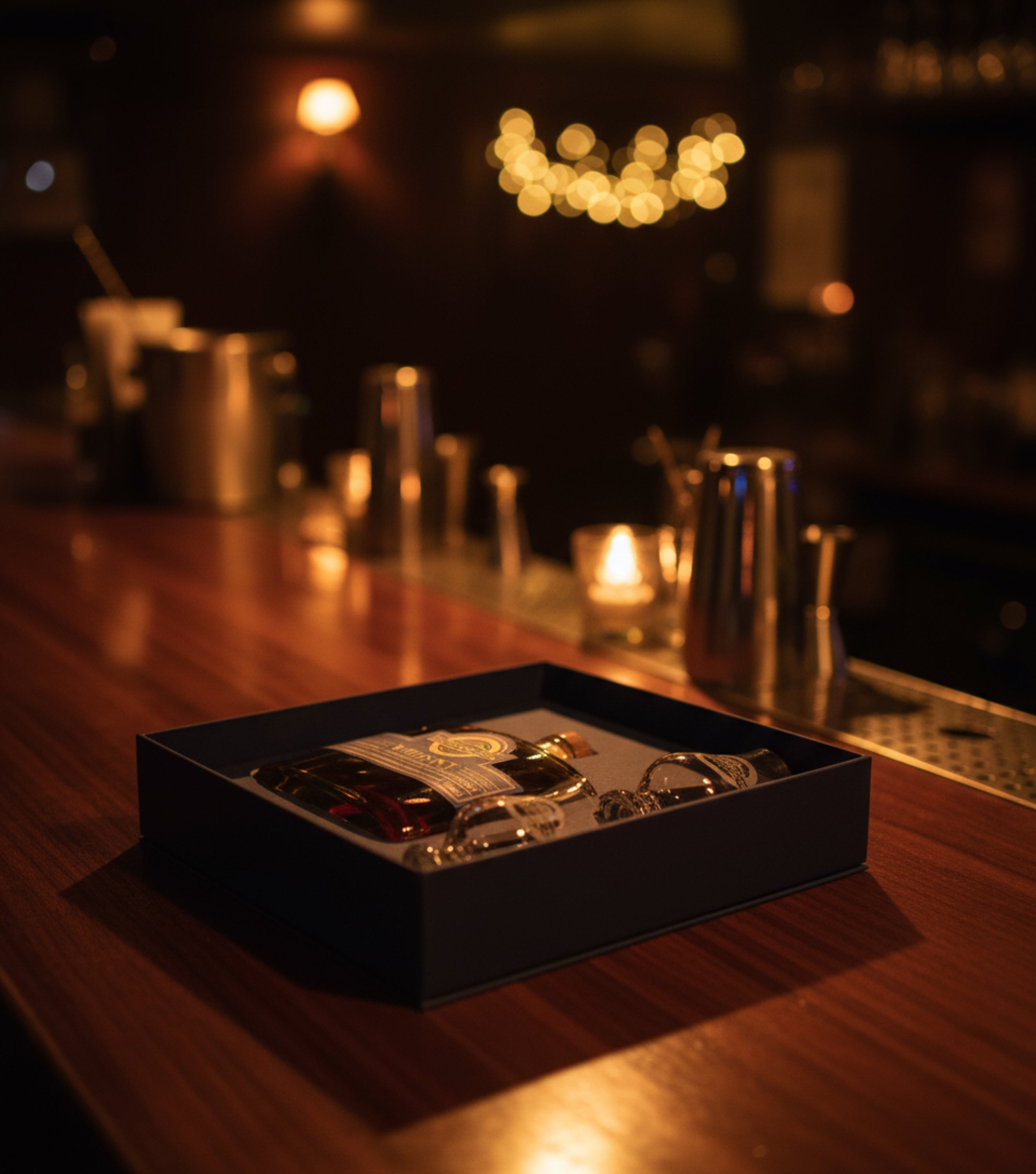 Our gift box contains two small crystal Glencairn whisky tasting glasses engraved with the Hunnington logo and a 200ml bottle of cask HD060.